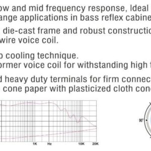 - Đáp ứng tần số thấp và trung bình tuyệt vời, lý tưởng cho âm trầm và ứng dụng âm trầm – tầm trung trong tủ phản xạ bass